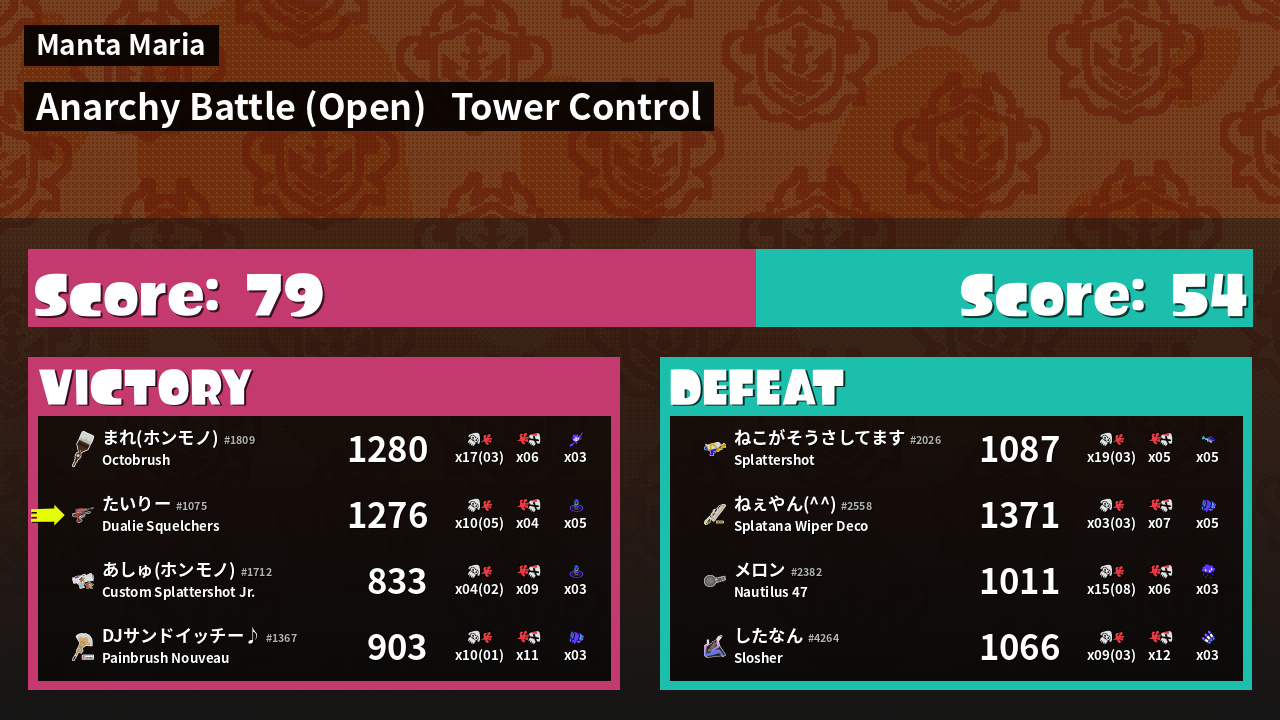 | Medals | #1 Super Jump Spot #1 Splat Assister #1 Tower Stopper | ||
