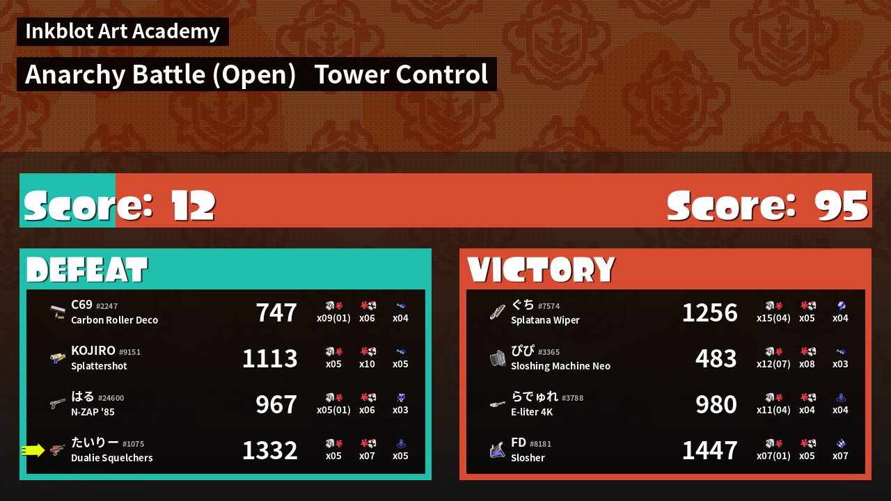| Medals | #1 Turf Inker #1 Wave Breaker User #2 Overall Splatter | ||