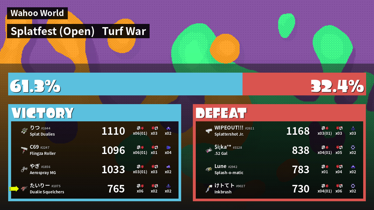 | Medals | #1 Overall Splatter #1 Popular Target #1 Enemy-Base Inker | ||