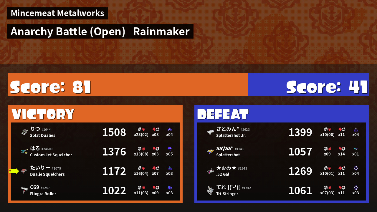| Medals | #1 Rainmaker Stopper #1 Wave Breaker User #2 Overall Splatter | ||