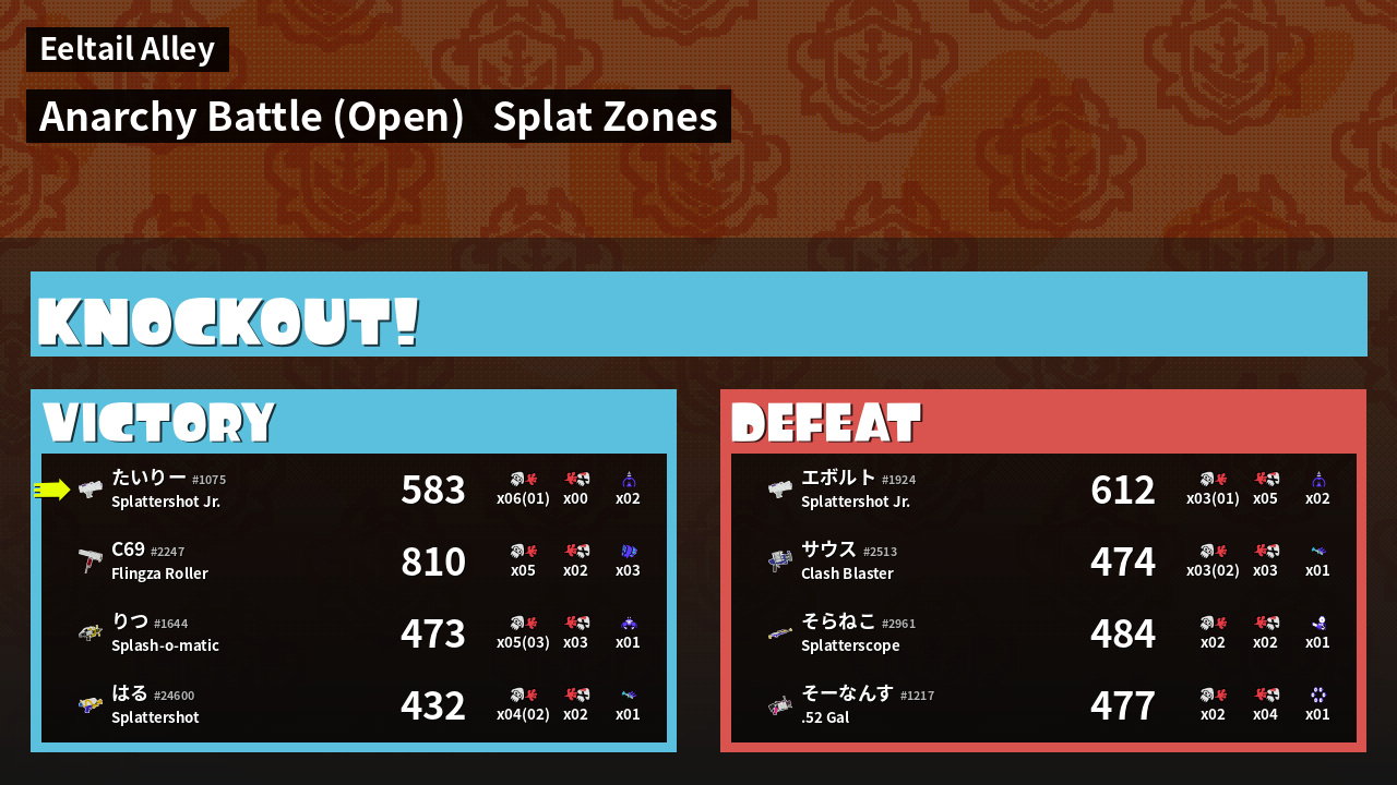 | Mode | Splat Zones - Anarchy Battle (Open) | ||