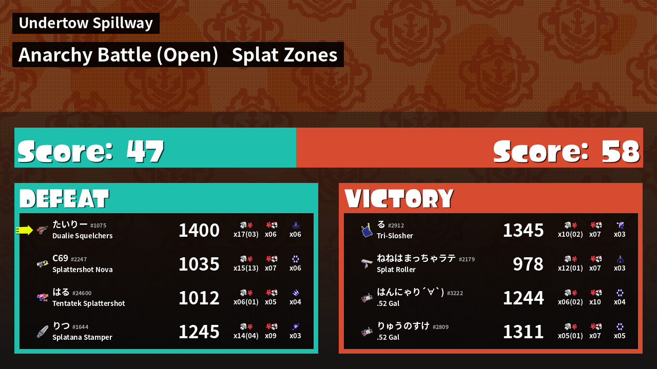 | Mode | Splat Zones - Anarchy Battle (Open) | ||