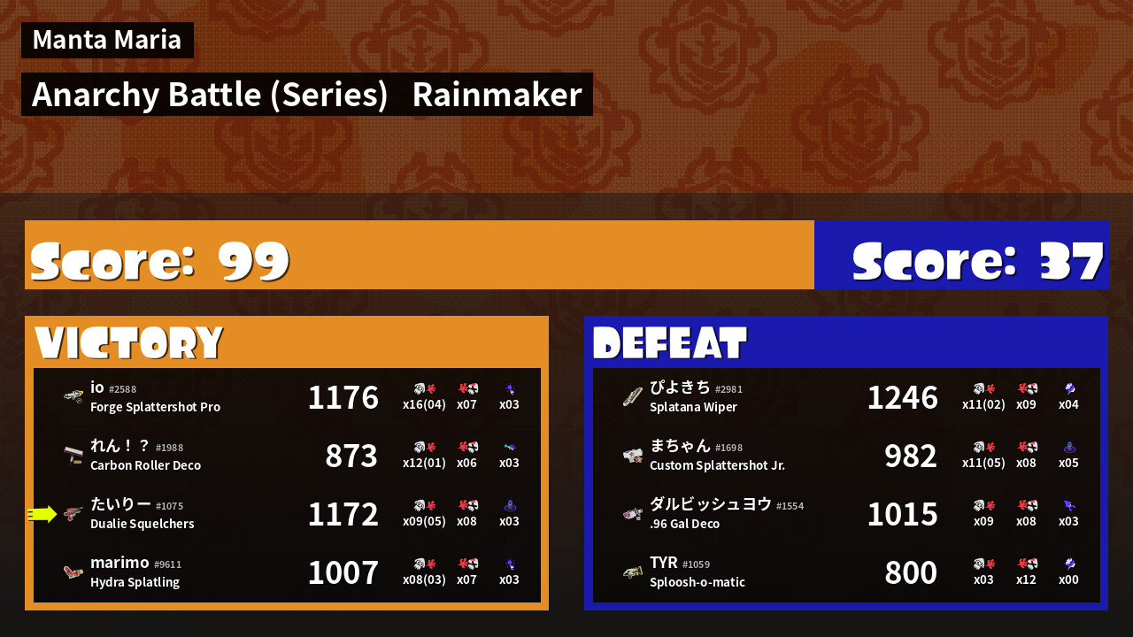 | Medals | #1 Splat Assister #1 Rainmaker Carrier #1 Ground Traveler | ||