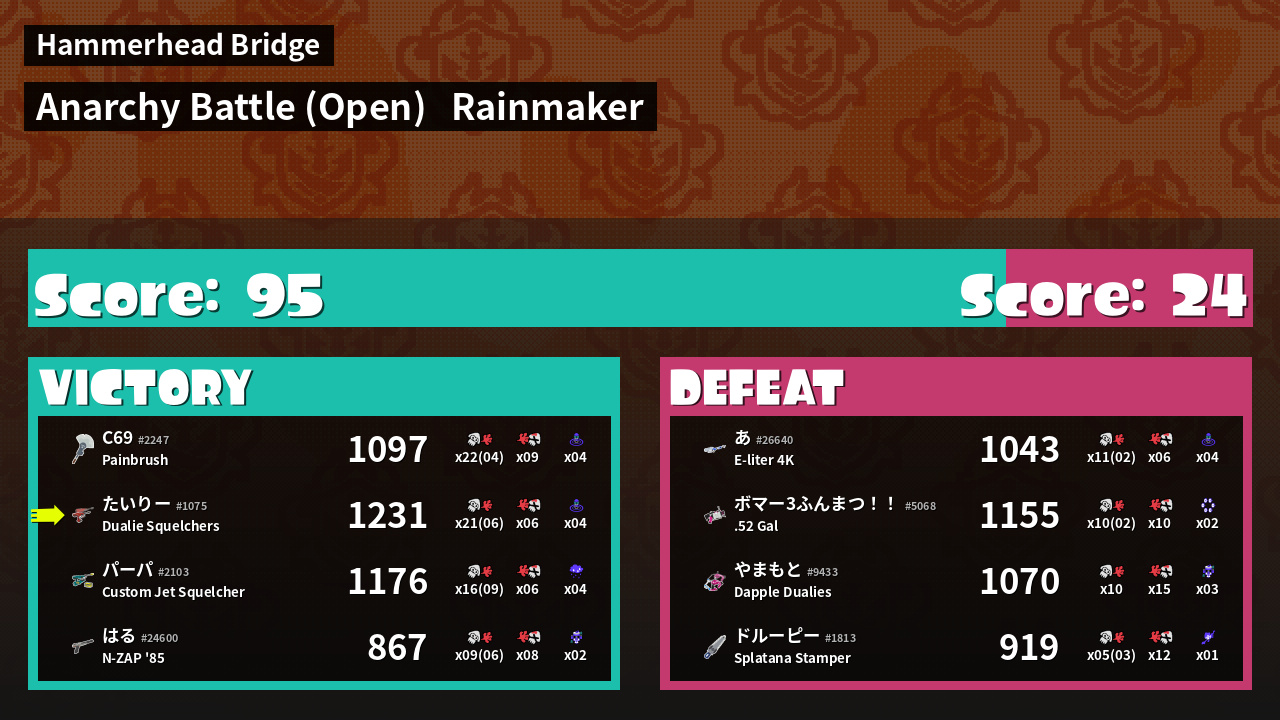 Kills / Deaths | 15 + 6 / 6 > Kill Ratio: 2.50 | ||