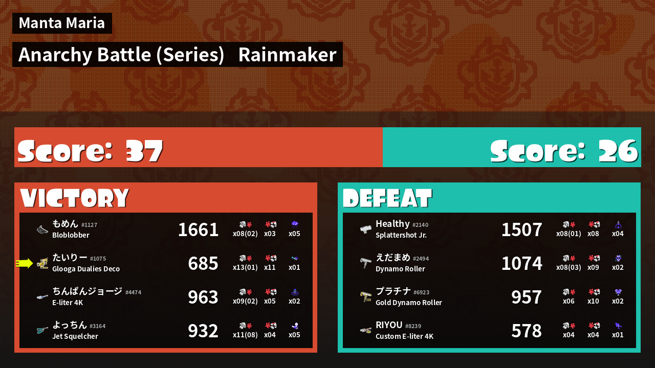 | Medals | #1 Overall Splatter #1 Enemy Splatter #1 Rainmaker Stopper | ||