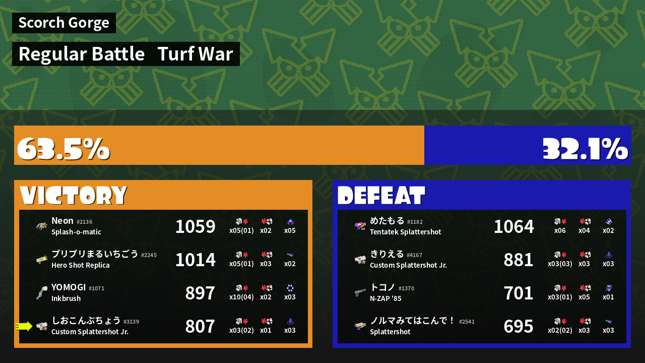 | バンカラな若者 しおこんぶちょう #3139 |  Custom Splattershot Jr.                    | 807 | 1 + 2 | 1 | 1.00 |  3 | |