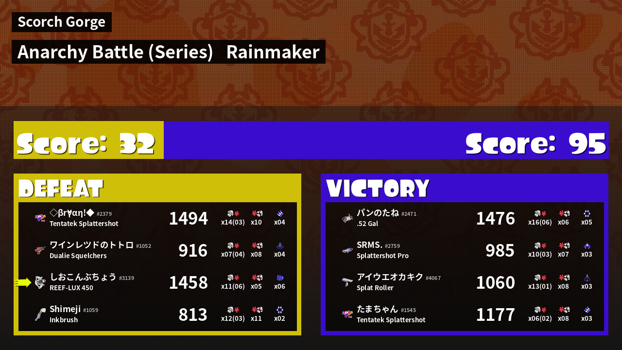 | えいえんのLOVE SRMS. #2759 |  Splattershot Pro                    | 985 | 7 + 3 | 7 | 1.00 |  3 | |