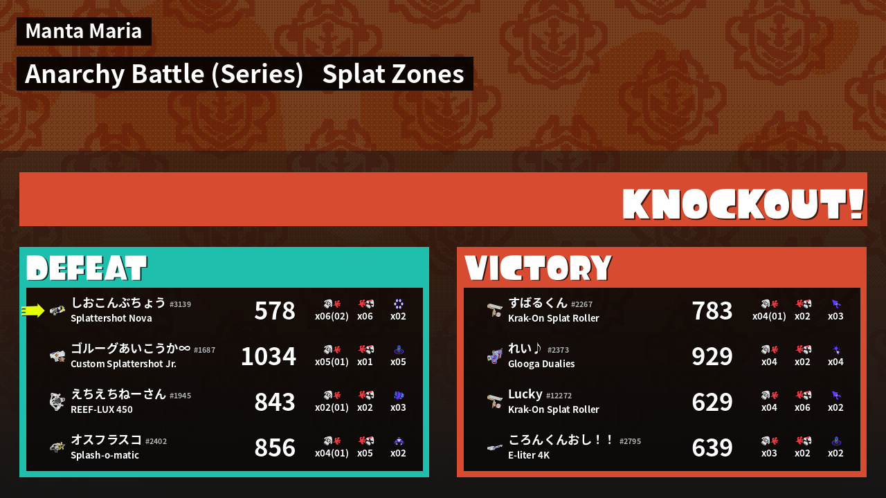 | ウルトラ夏祭り しおこんぶちょう #3139 |  Splattershot Nova                    | 578 | 4 + 2 | 6 | 0.67 |  2 | |