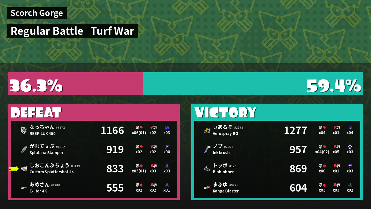 | バンカラな若者 しおこんぶちょう #3139 |  Custom Splattershot Jr.                    | 833 | 2 + 1 | 3 | 0.67 |  3 | |