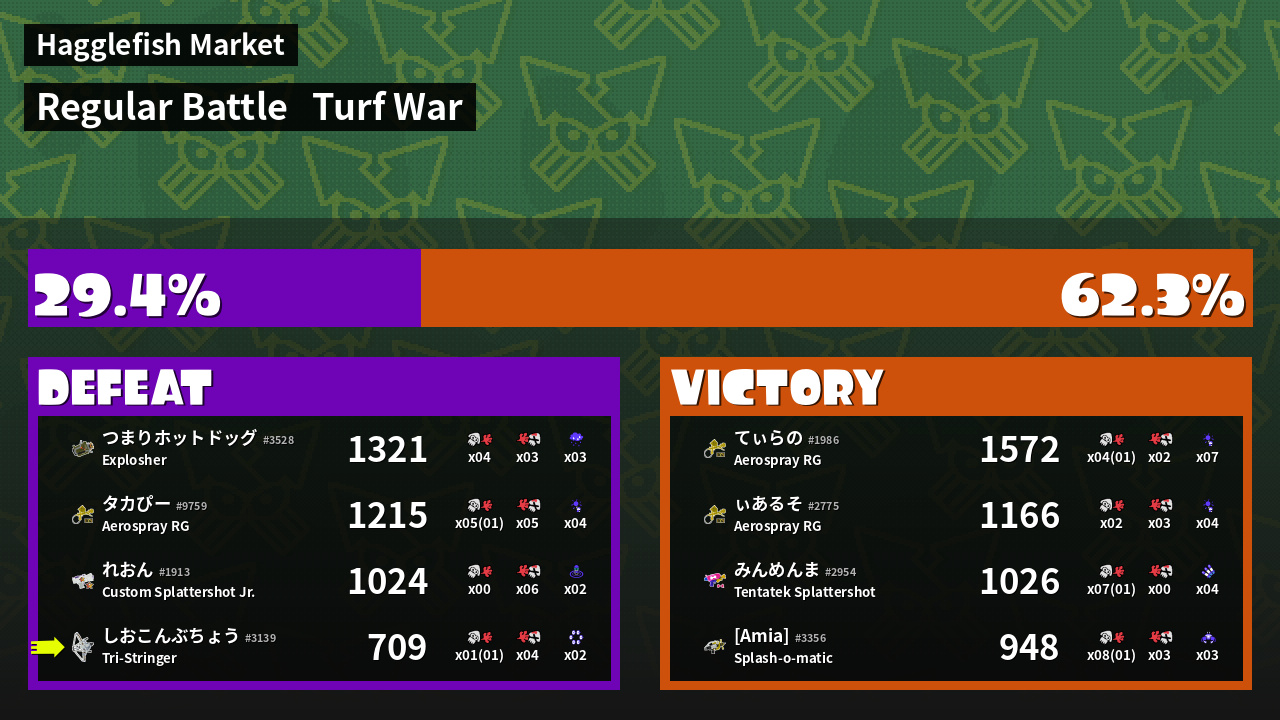 | バンカラな若者 みんめんま #2954 |  Tentatek Splattershot                    | 1,026 | 6 + 1 | 0 | 99.99 |  4 | |