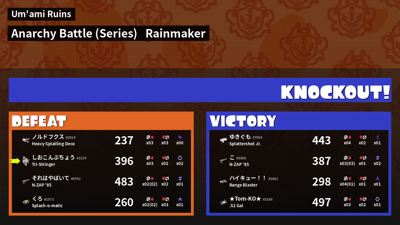 | おいしいシャケライフ ノルドフクス #2014 |  Heavy Splatling Deco                    | 237 | 3 + 0 | 3 | 1.00 |  0 | |