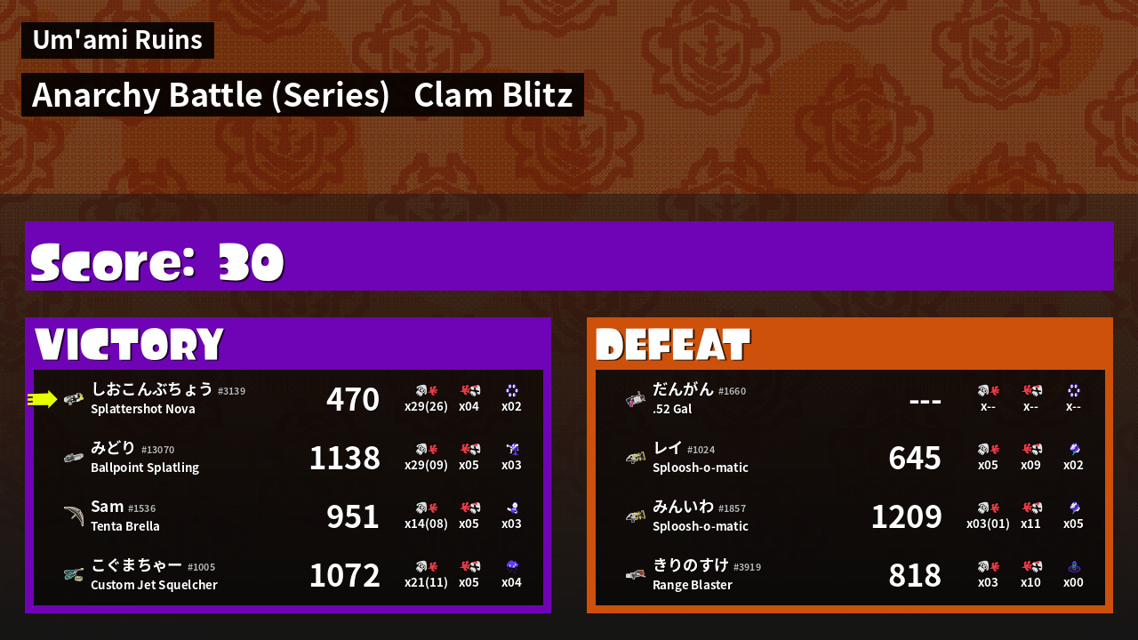| ウルトラ夏祭り しおこんぶちょう #3139 |  Splattershot Nova                    | 470 | 3 + 26 | 4 | 0.75 |  2 | |