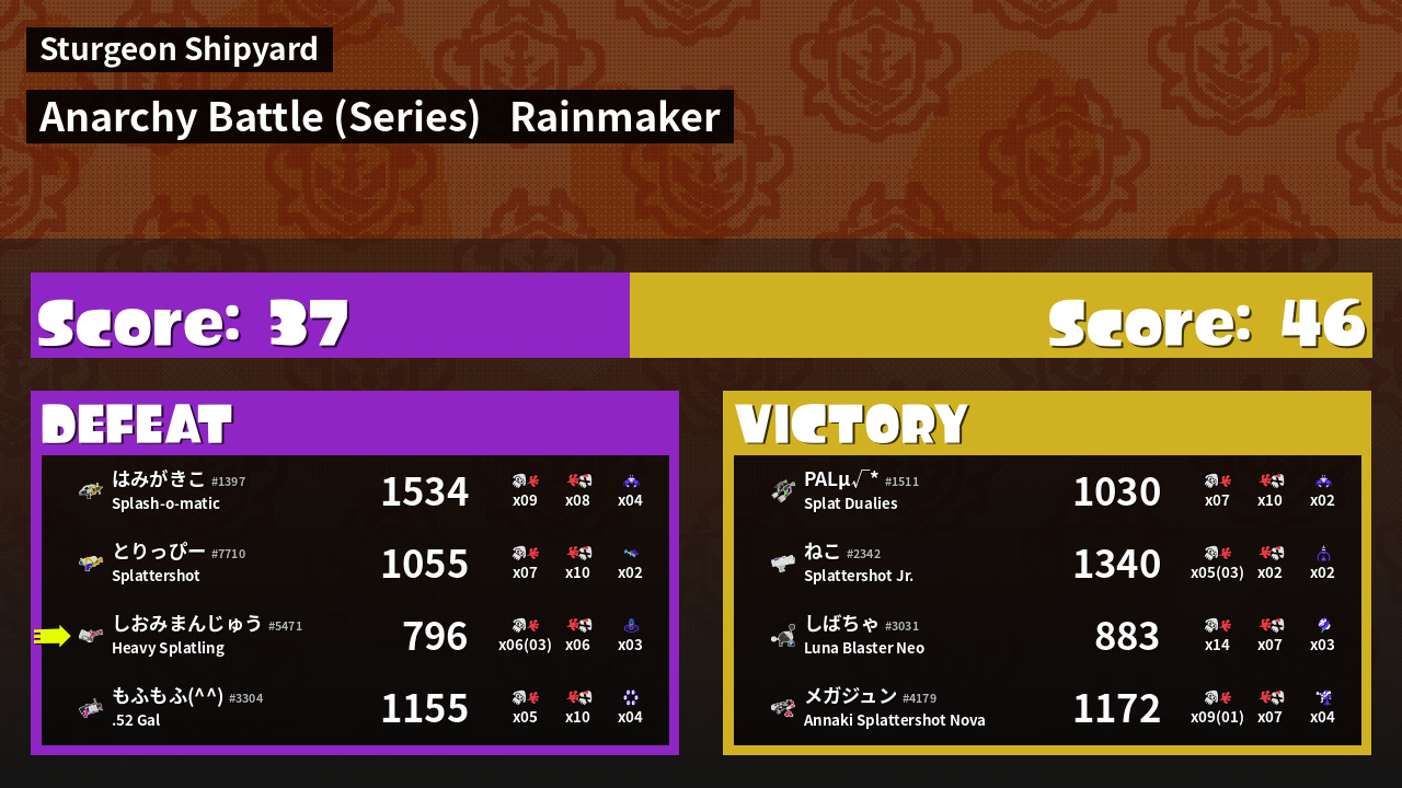 | Medals | #1 Super Jump Spot #1 Splat Assister #1 Damage Taker | ||