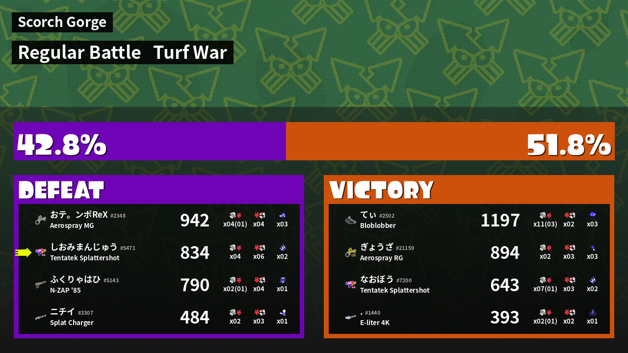 | Medals | #1 Overall Splatter #1 Enemy-Base Inker #1 Enemy Splatter | ||
