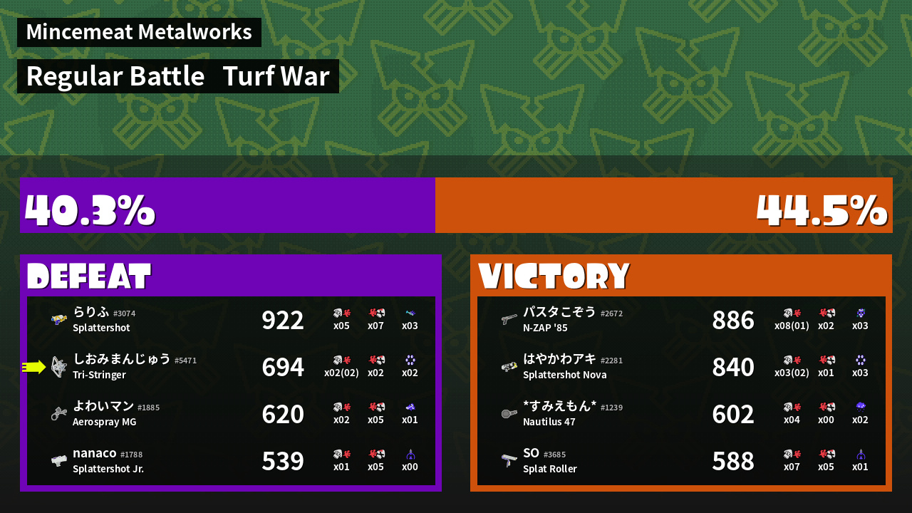 | Medals | #1 Splat Assister #1 Base Defender #1 Damage Taker | ||