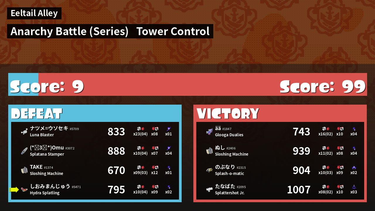| Medals | #1 Splat Assister #2 Overall Splatter #2 Enemy Splatter | ||