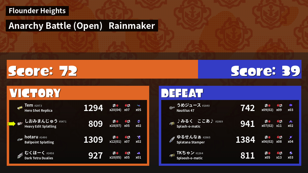 | Medals | #1 Popular Target #1 Splat Assister #1 Rainmaker Stopper | ||
