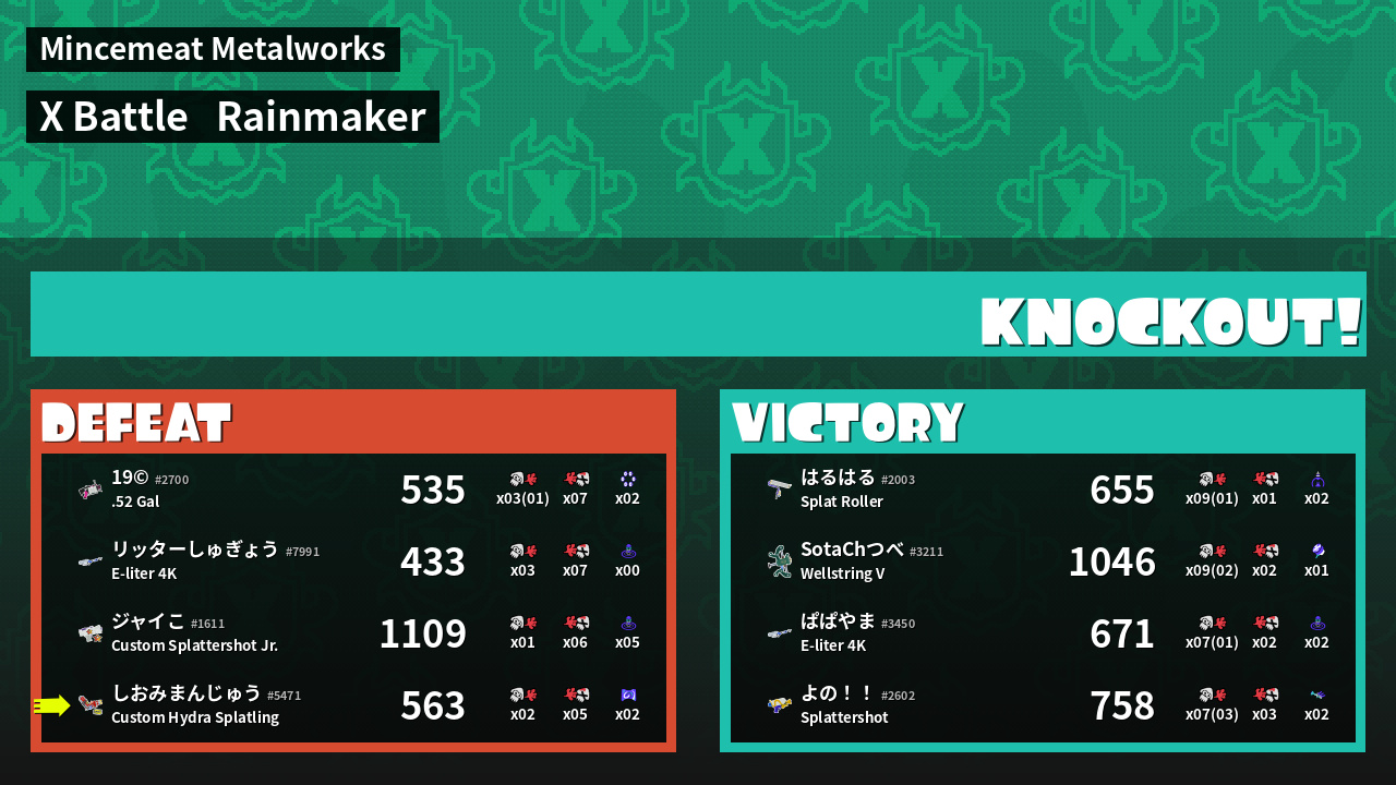 | Weapon | Custom Hydra Splatling ( Ink Mine / Splattercolor Screen) | ||
