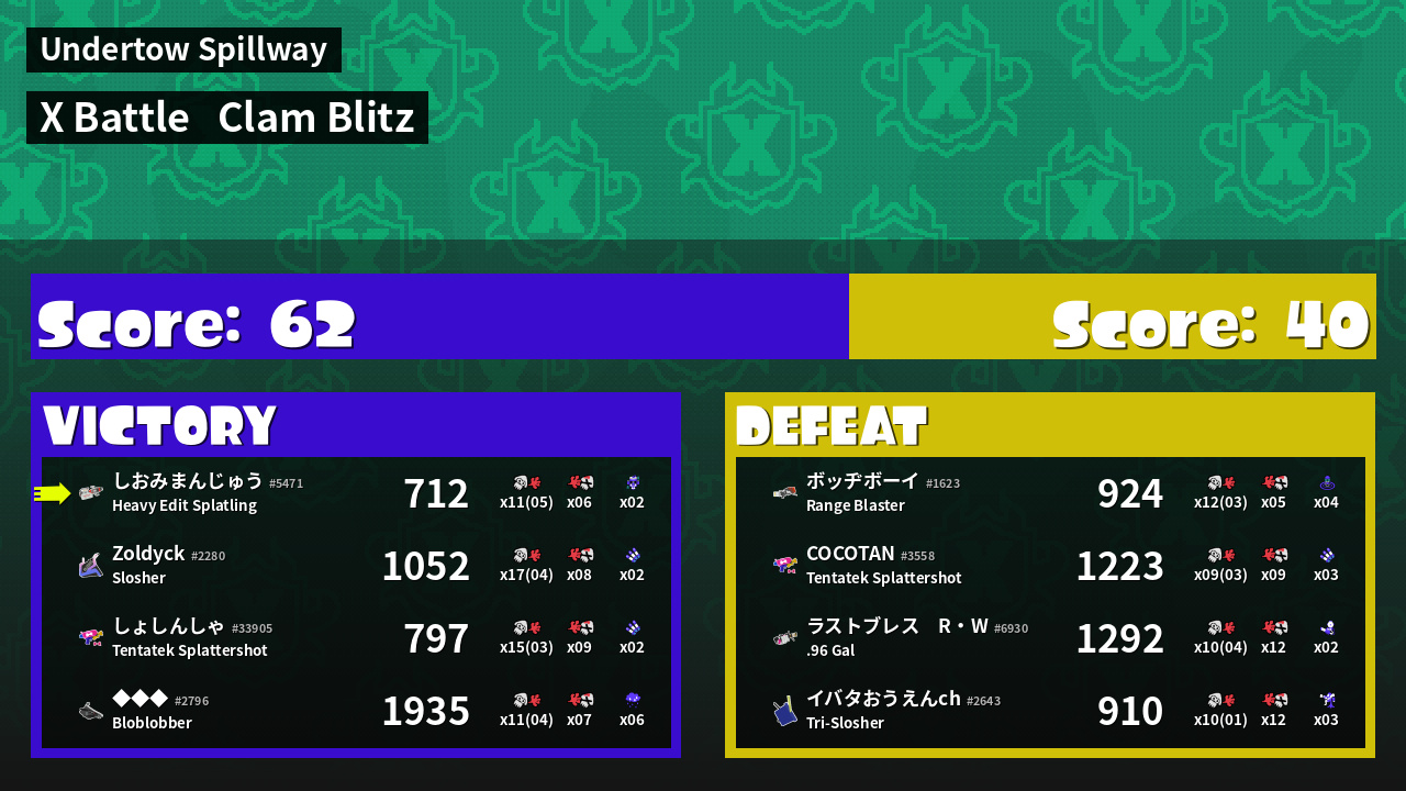 | Medals | #1 Clam Carrier #1 Super Jump Spot #1 Splat Assister | ||