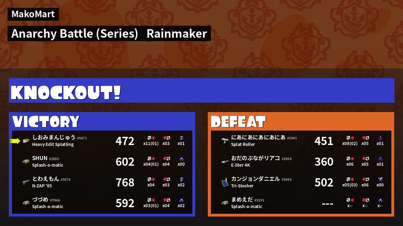 | Medals | #1 Overall Splatter #1 Enemy Splatter #1 Splat Assister | ||