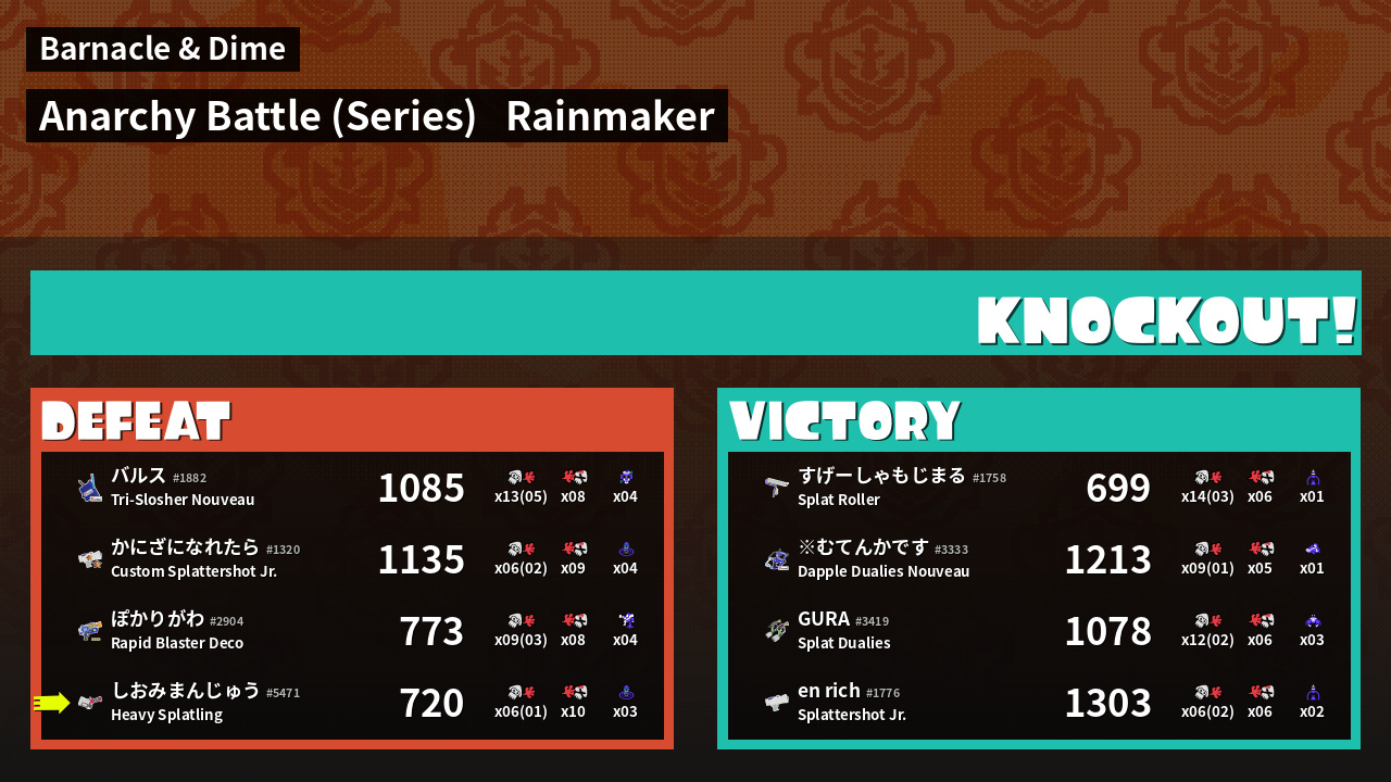 | Weapon | Heavy Splatling ( Sprinkler / Wave Breaker) | ||