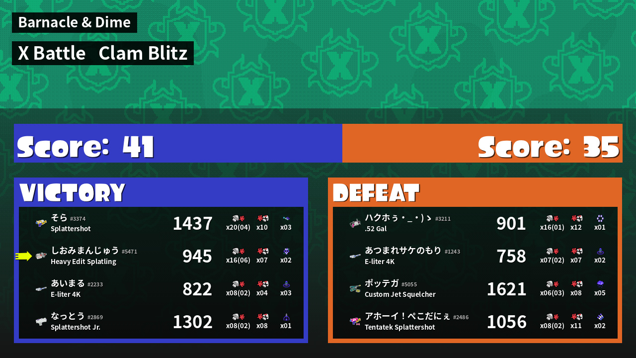 | Medals | #1 Clam Carrier #1 Super Jump Spot #1 Splat Assister | ||