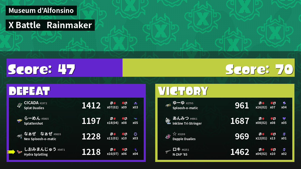 | Medals | #1 Splat Assister #1 Rainmaker Stopper #2 Overall Splatter | ||