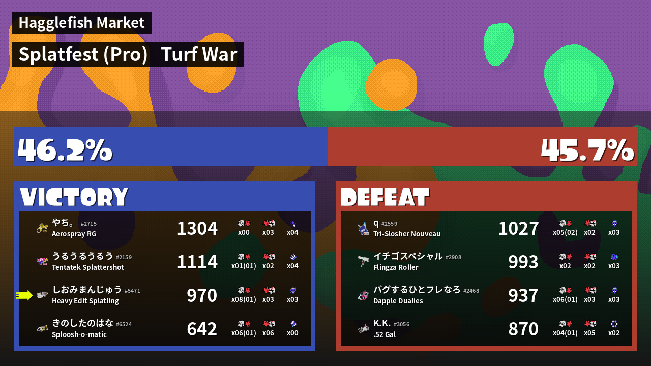| Medals | #1 Overall Splatter #1 Enemy Splatter #1 Splat Assister | ||