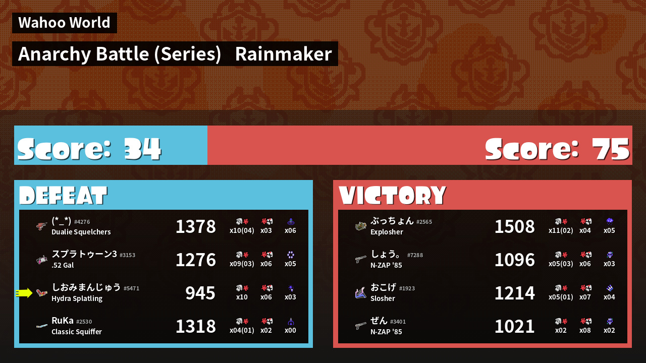 | Medals | #1 Overall Splatter #1 Enemy Splatter #1 Rainmaker Carrier | ||