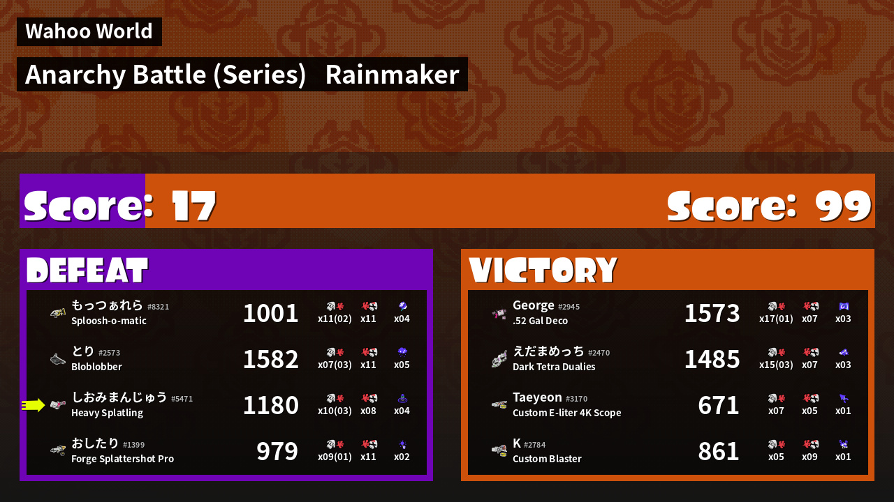 | Medals | #1 Splat Assister #1 Rainmaker Stopper #1 Wave Breaker User | ||