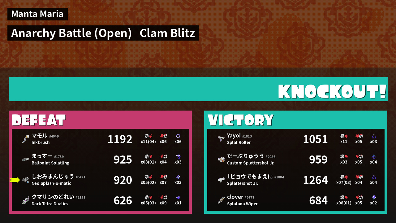 | Mode | Clam Blitz - Anarchy Battle (Open) | ||