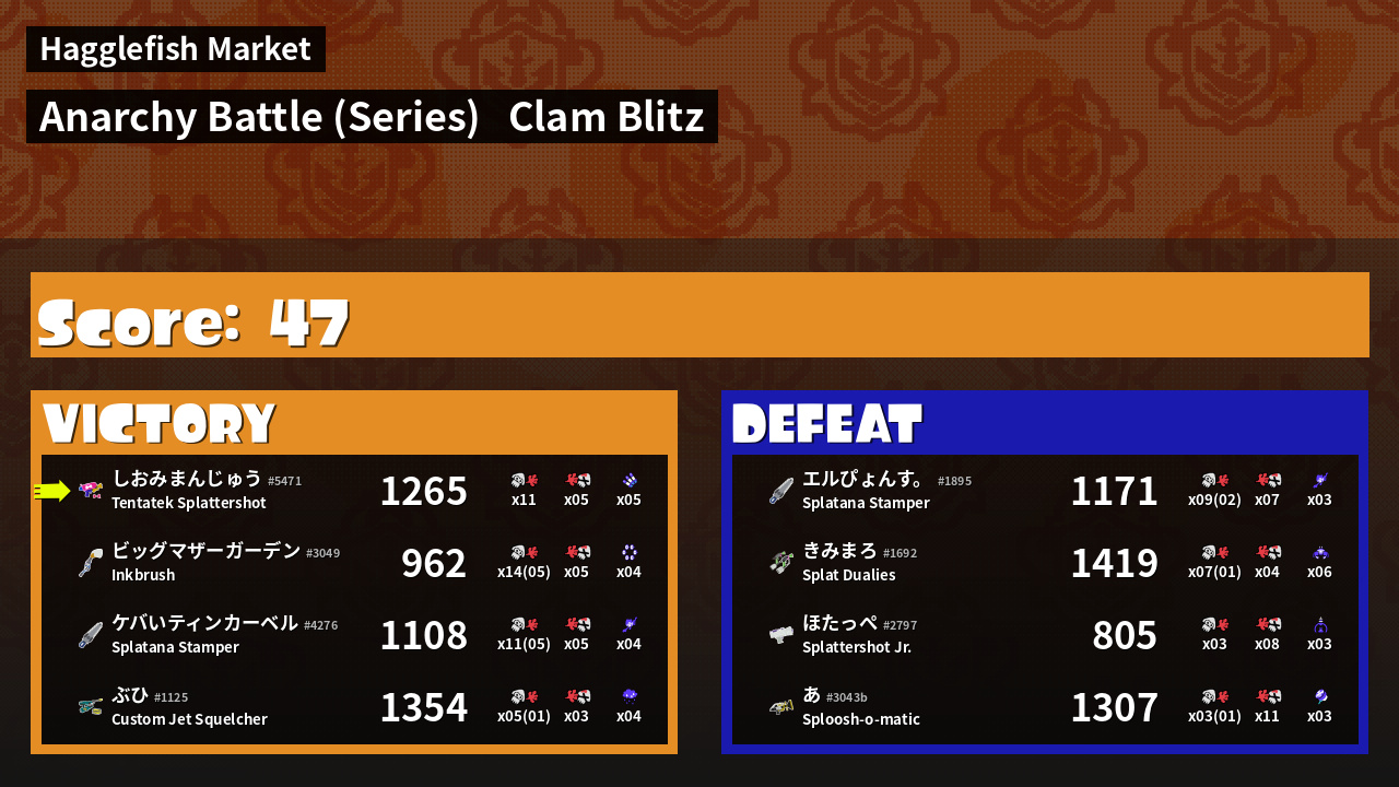 | Medals | #1 Clam Carrier #1 Popular Target #1 Enemy Splatter | ||