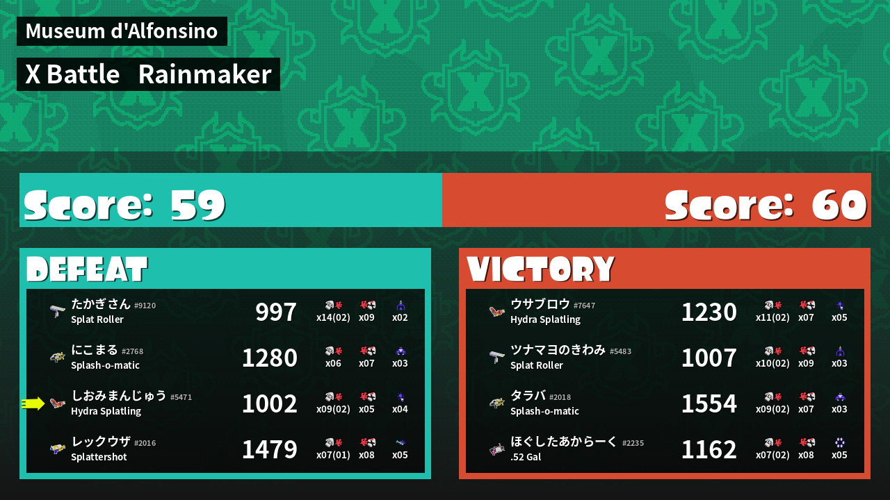 | Medals | #1 Splat Assister #1 Rainmaker Stopper First Splat! | ||