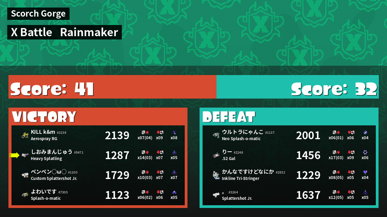 | Medals | #1 Overall Splatter #1 Enemy Splatter #1 Wave Breaker User | ||