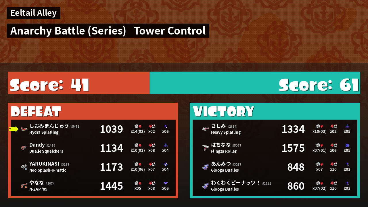 | Medals | #1 Overall Splatter #1 Popular Target #1 Super Jump Spot | ||