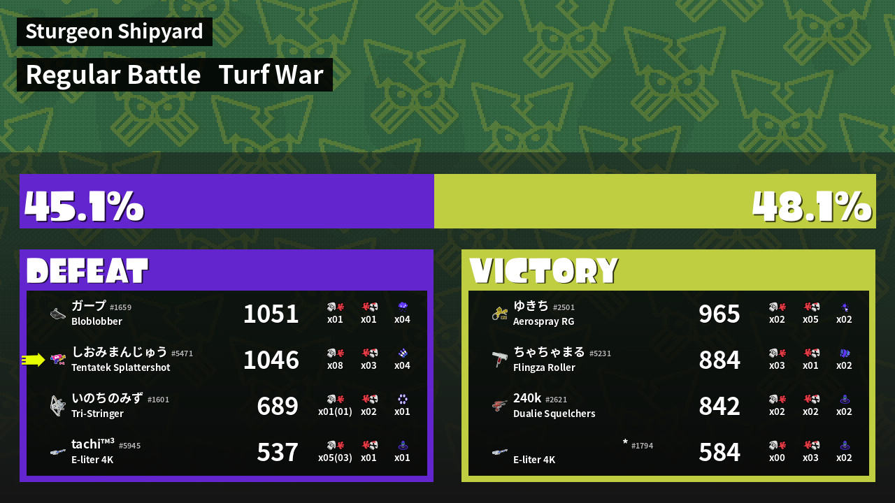 | Medals | #1 Overall Splatter #1 Popular Target #1 Enemy-Base Inker | ||