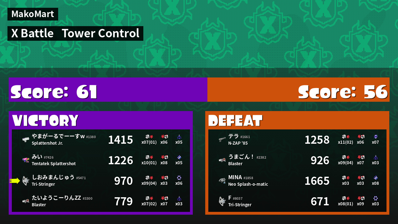| Medals | #1 Super Jump Spot #1 Splat Assister #1 Tower Stopper | ||