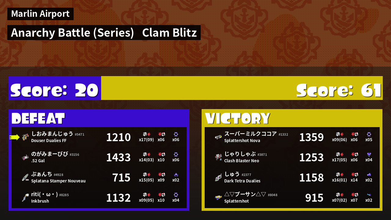 | Medals | #1 Overall Splatter #1 Clam Carrier #1 Super Jump Spot | ||