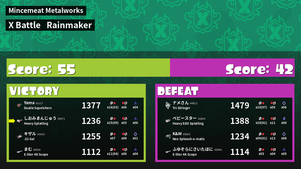 | Medals | #1 Popular Target #1 Splat Assister #1 Rainmaker Stopper | ||