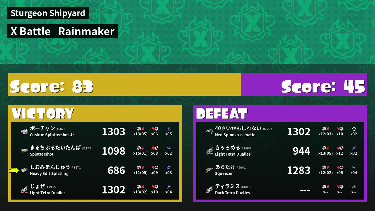 | Medals | #1 Splat Assister #1 Tacticooler User #2 Popular Target | ||