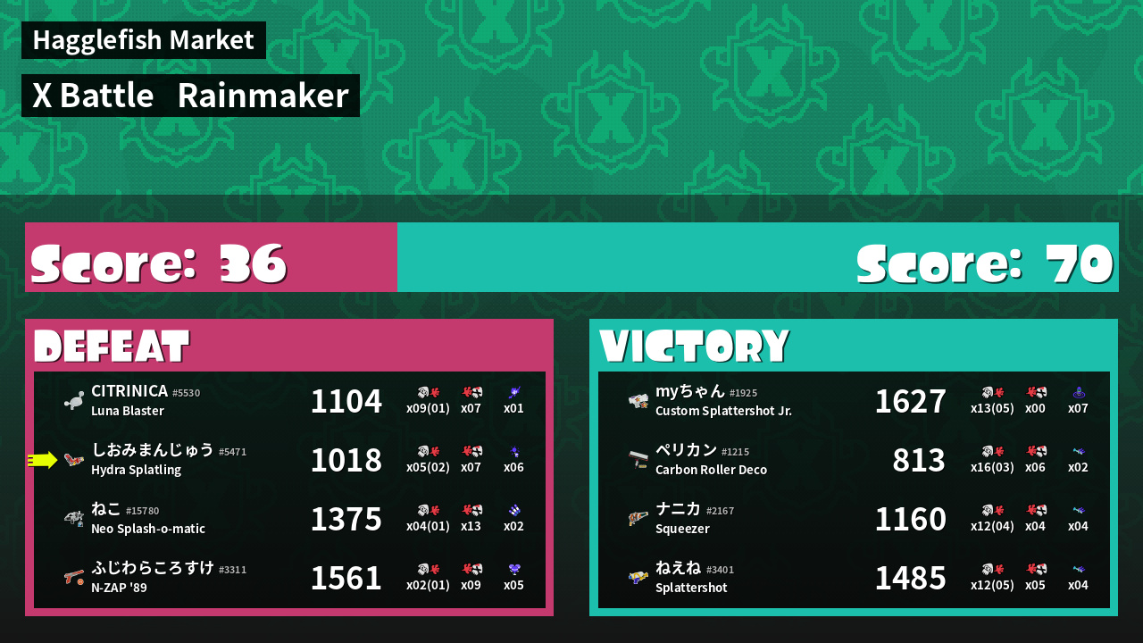 | Medals | #1 Popular Target #1 Splat Assister #2 Overall Splatter | ||