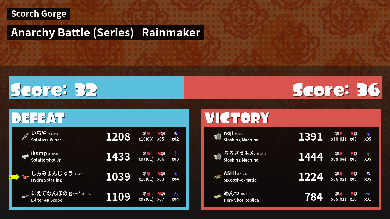 | Medals | #1 Overall Splatter #1 Enemy Splatter #1 Rainmaker Stopper | ||
