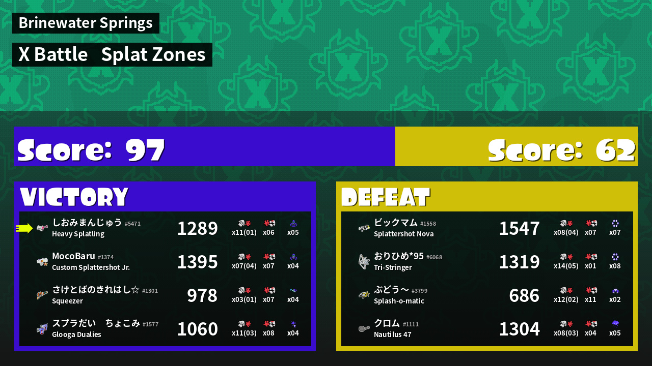 | Medals | #1 Overall Splatter #1 Splat Zone Guard #1 Enemy Splatter | ||