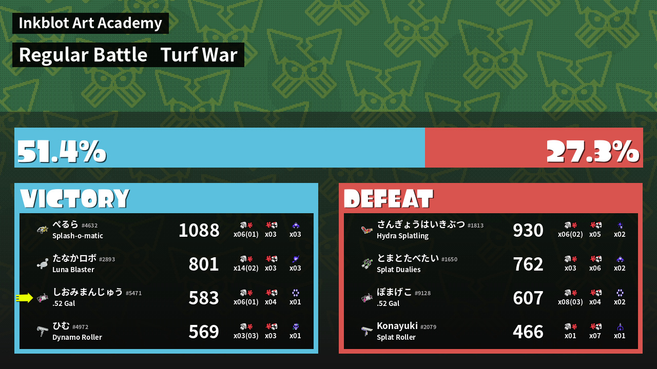| Medals | #1 Damage Taker #2 Overall Splatter #2 Enemy-Base Inker | ||||