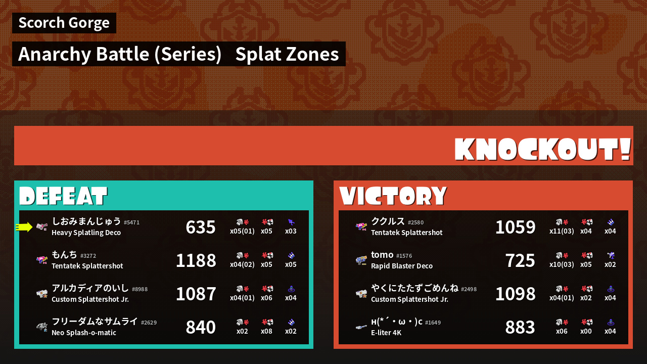 | Medals | #1 Overall Splatter #1 Splat Zone Guard #1 Enemy Splatter | ||