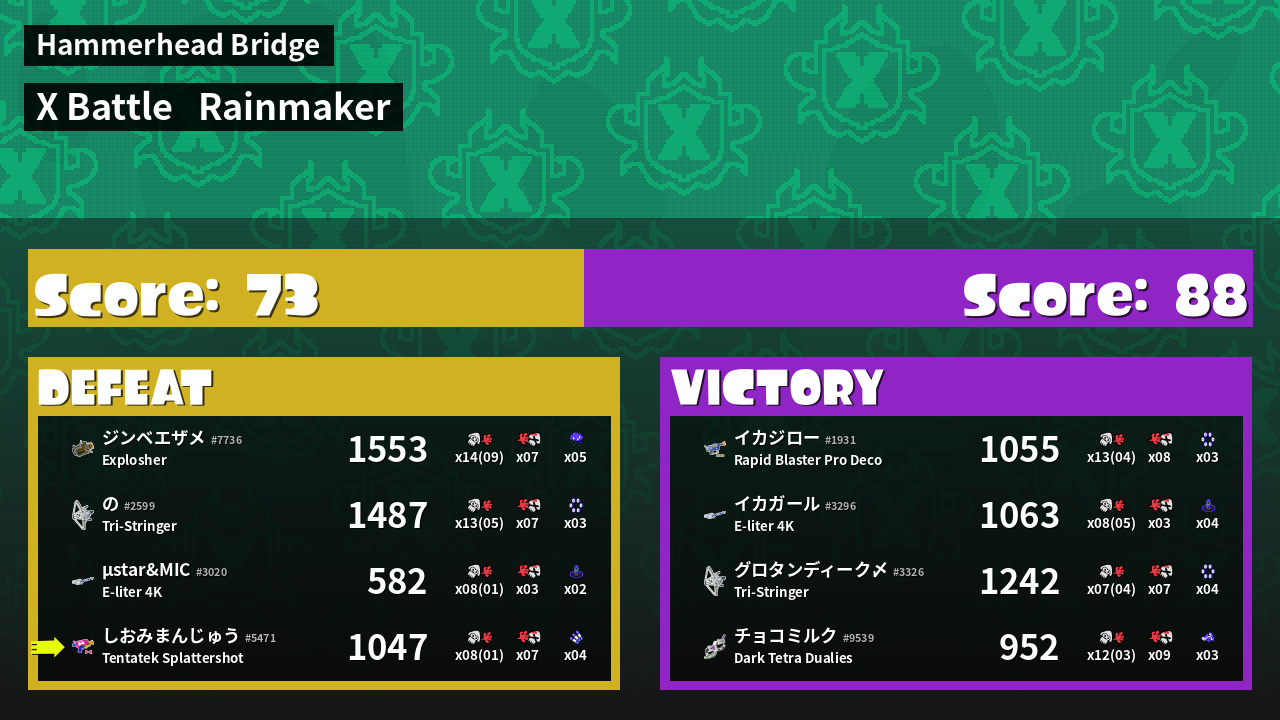 | Weapon | Tentatek Splattershot ( Splat Bomb / Triple Inkstrike) | ||