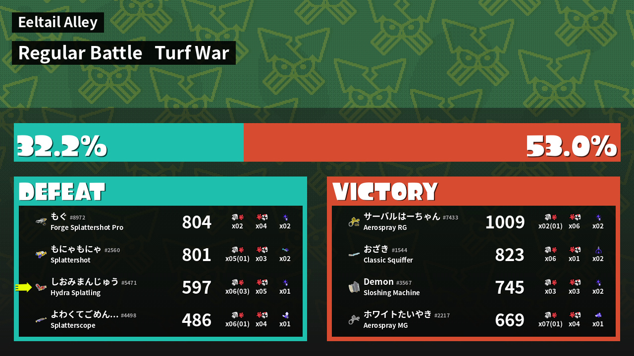| Medals | #1 Overall Splatter #1 Enemy-Base Inker #1 Splat Assister | ||
