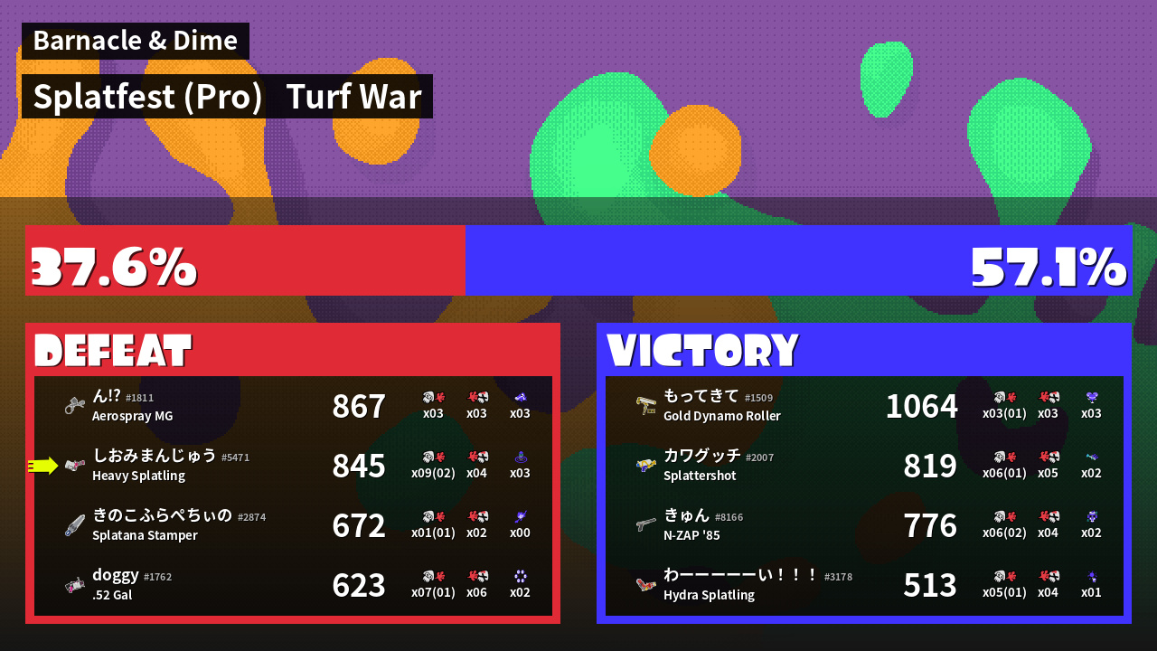 | Medals | #1 Overall Splatter #1 Enemy Splatter #1 Splat Assister | ||
