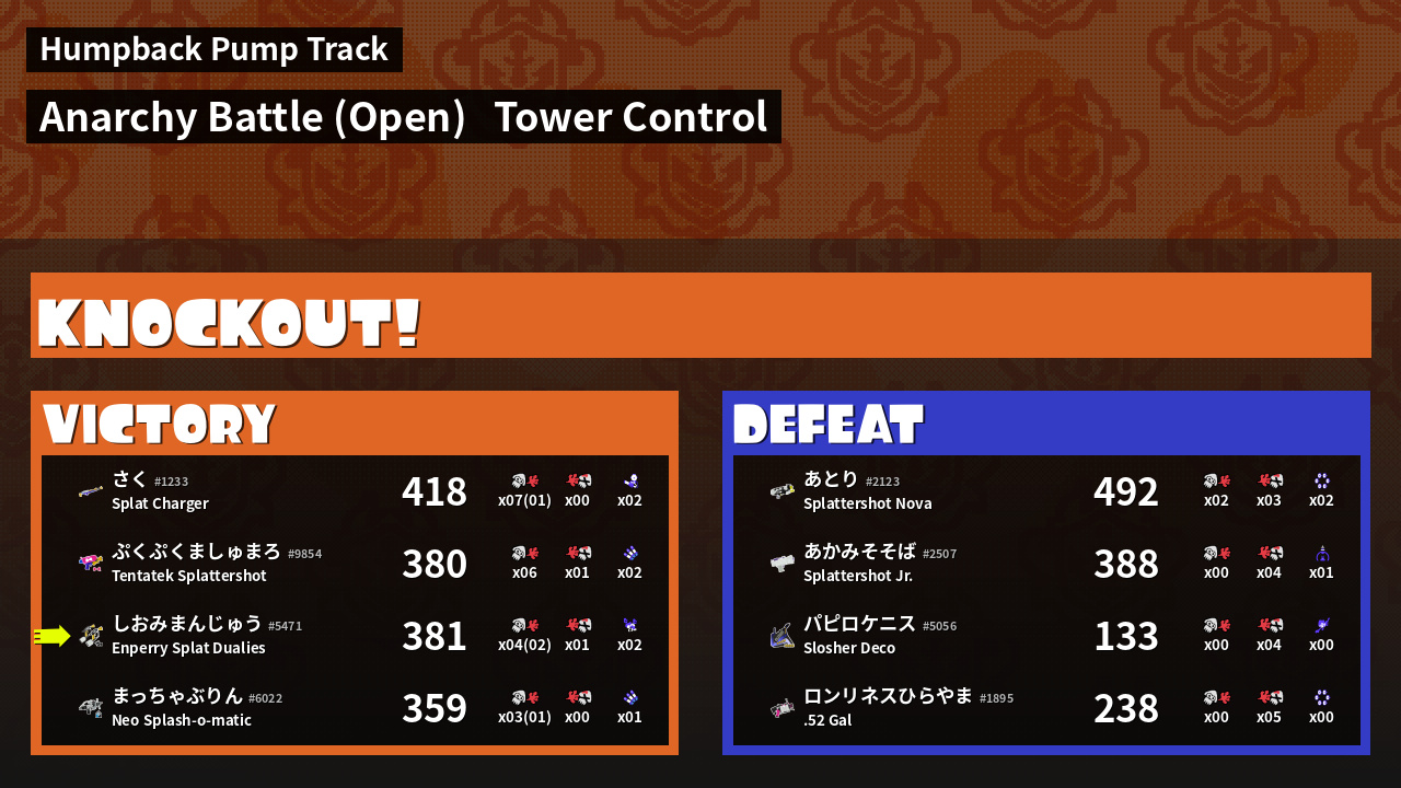 | Weapon | Enperry Splat Dualies ( Curling Bomb / Triple Splashdown) | ||