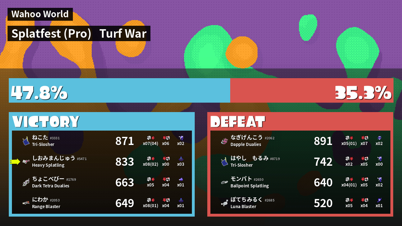| Mode | Turf War - Splatfest (Pro) | ||